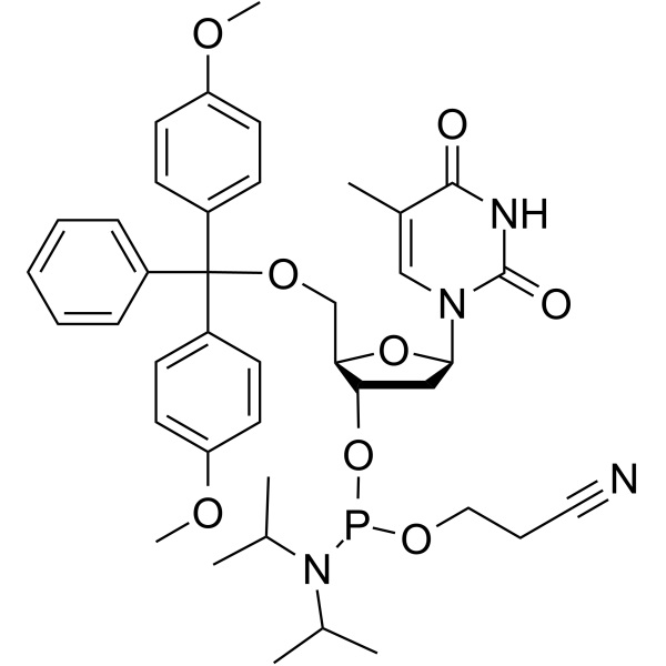 DMT-dT Phosphoramidit (5'-O-DMT-Thymidin 3'-CE Phosphoramidit) (CAS: 98796-51-1) ist ein modifizierter Baustein, der in der Festphasensynthese von DNA- und RNA-Oligonukleotiden verwendet wird. Es ist ein Derivat von Desoxythymidin (dT) mit einer Phosphoramiditgruppe an der 3'-OH-Position. Dieses modifizierte Nukleosid verfügt über eine Dimethoxytritylgruppe (DMT), die die 5'-OH-Funktion schützt, was seine Stabilität erhöht und seine Reaktivität verringert.
