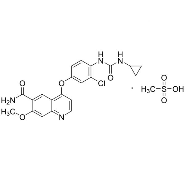 Lenvatinib-Mesylat (CAS: 857890-39-2) ist ein oraler und vielseitig einsetzbarer Inhibitor von VEGFR1-3, FGFR1-4, PDGFR, KIT und RET mit starker Antitumoraktivität. Lenvatinibmesylat ist ein Rezeptortyrosinkinase (RTK)-Inhibitor mit Selektivität für VEGFR2. Es weist antineoplastische Aktivität auf und ist für die Behandlung von Patienten mit lokal rezidivierendem oder metastasiertem, progressivem, refraktärem, differenziertem Schilddrüsenkrebs mit radioaktivem Jod (RAI) indiziert. Lenvatinibmesylat wurde erstmals am 13. Februar 2015 von der US-amerikanischen Food and Drug Administration (FDA), dann am 26. März 2015 von der Pharmaceuticals and Medical Devices Agency of Japan (PMDA) und am 28. Mai 2015 von der European Medicine Agency (EMA) zugelassen. Es wurde von Eisai als Lenvima® entwickelt und vermarktet. Lenvatinib-Mesylat ist ein oraler Multirezeptor-Tyrosinkinaseinhibitor mit einem einzigartigen Bindungsmodus, der selektiv die Kinaseaktivitäten von VEGF-Rezeptoren (Vascular Endothelial Growth Factor) hemmt, zusätzlich zu anderen Tyrosinkinasen, die mit dem proangiogenen und onkogenen Signalweg in Zusammenhang stehen und vermutlich an der Tumorproliferation beteiligt sind. Es ist für die Behandlung von progressivem radiojodhaltigem differenziertem Schilddrüsenkrebs indiziert. Lenvima wird allein zur Behandlung des differenzierten Schilddrüsenkrebses (DTC) eingesetzt, einer Schilddrüsenkrebsart, die nicht mehr mit radioaktivem Jod behandelt werden kann und fortschreitet. LENVIMA wird zusammen mit einem anderen Arzneimittel namens Everolimus zur Behandlung von Erwachsenen mit einer Nierenkrebsart namens fortgeschrittenem Nierenzellkarzinom (RCC) nach einer Behandlung mit einem anderen Krebsmedikament angewendet.